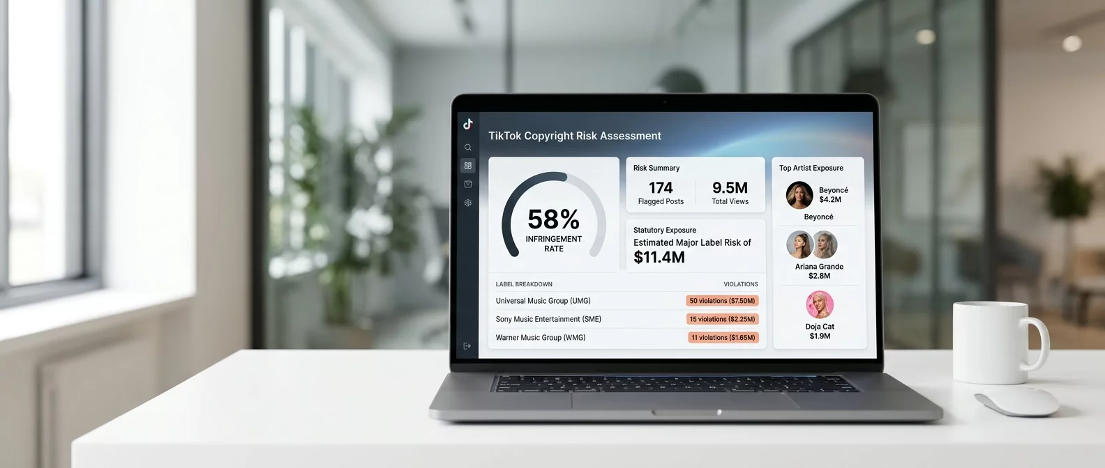 The average brand has 63 violations they don’t know about. Background music in a lifestyle clip counts. A trending sound your influencer used counts. That’s what our audit uncovers.